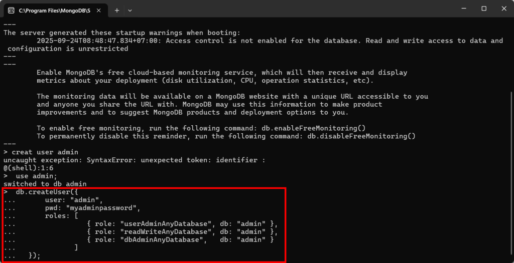 จากนั้นนำไปว่างใน console terminal ที่เปิดขึ้นจากการรันไฟล์ mongo.exe แล้ว Enter