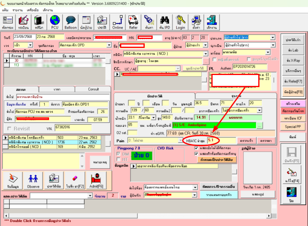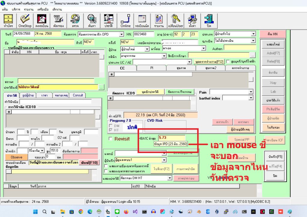Himpro Desktop มีช่องแสดงค่าแลป HbA1c ล่าสุด ในหน้าคัดกรอง,doctor,pcu โดยจะดึงผลล่าสุดมาแสดงให้ผู้ใช้เห็น และเมื่อใช้เมาส์ไปชี้ที่ช่องผลแลป จะแสดงวันที่ออกผลแลปนั้น