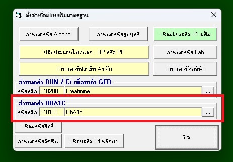 กำหนดค่า HBA1C โดยกดที่ปุ่ม … , ค้นหาแลป hba1c แล้วคลิกเลือก จากนั้นกด “ปิด”