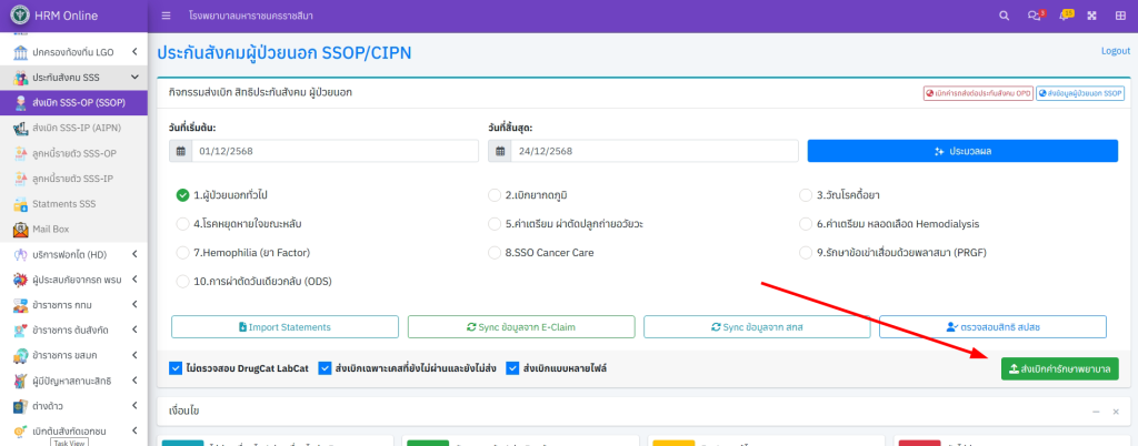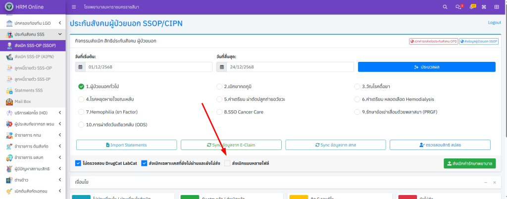 Login เข้าสู่ระบบ HRM แล้วไปที่เมนู ส่งเบิก SSS-OP จากนั้นติ๊ก “ส่งเบิกแบบหลายไฟล์”