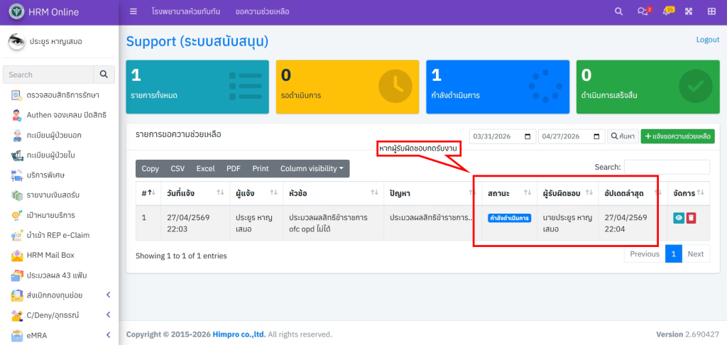 ตัวอย่าง หากมีทีม support ตอบรับงานแล้ว สามารถตรวจสอบสถานะได้จากคอลั่ม “สถานะ”